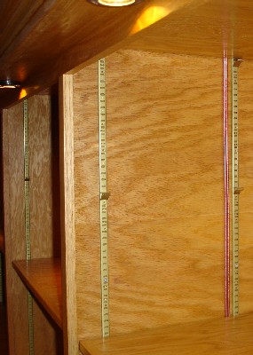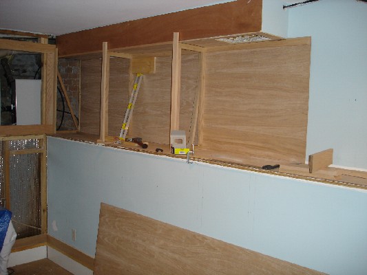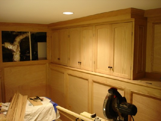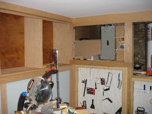 Framing out the panels and building the shelves was a big job. The shelves were assembled as 2 units and then mounted in place. Then the top soffit and front molding were added.The storage space in the back is also lined with a level shelf. And a couple extra shelves were added for storage of smaller stuff.