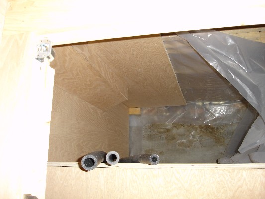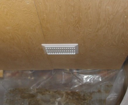 This storage area is connected to the space for the water heater and water pipes. In order to ventilate this area, I installed a fan in the ceiling. I routed the exhaust into a hose and take it up through the ceiling.
