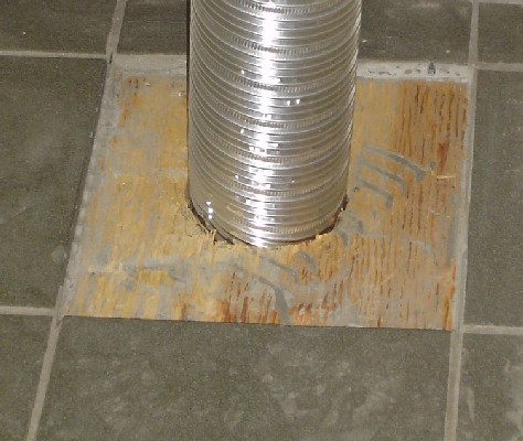 Carefully removing a single stone tile is not easy or fun. But once removed, I could drill a tap hole in the floorboard. It is 1.5″ thick plywood (2 pieces 3/4″ each)! That seems like a lot. With an adequate tap hole, I used a reciprocating saw and a template to cut the hole to fit the exhaust hose.This hose leads to the laundry vent out of the house.