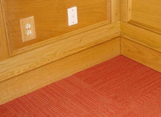 Paneling continues around the lower half of the room. I added a baseboard with a molding on top to match the panel molding. You can see the ceramic tile floor, too. It’s very loud with the miter saw and vacuum.