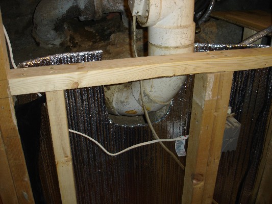 In order to protect the electrical lines and interior walls from possible water damage, I added waterproof insulation. If any water were to come from the pipes or wall, it should stay behind the insulation to the floor, then drain into the sump pump hole.